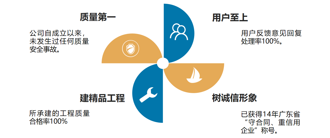 自成立以来,公司秉持“质量第一,用户至上,建精品工程,树诚信形象”的质量方针,坚持实施名牌战略,为社会、为用户提供一流的工程产品和一流的技术服务。所承建的项目均以优质诚信和优良服务赢得同行与用户的广泛赞誉。